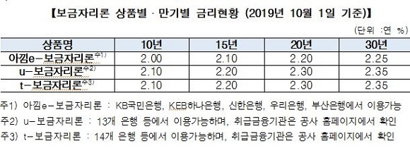 이에 주금공 홈페이지를 통해 신청하는 ‘u-보금자리론’과 은행 창구에서 신청하는 ‘t-보금자리론’은 대출 만기에 따라 연 2.10%(만기 10년)에서 최대 2.35%(30년)로 이용할 수 있다.
