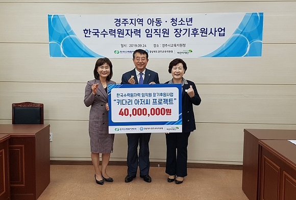 한국수력원자력(이하 한수원)은 24일 경주교육지원청에서 초록우산어린이재단 경북지역본부와 ‘경주지역 아동·청소년 대상 장기 후원(키다리 아저씨 프로젝트)’을 위한 후원금 전달식을 열었다고 밝혔다.