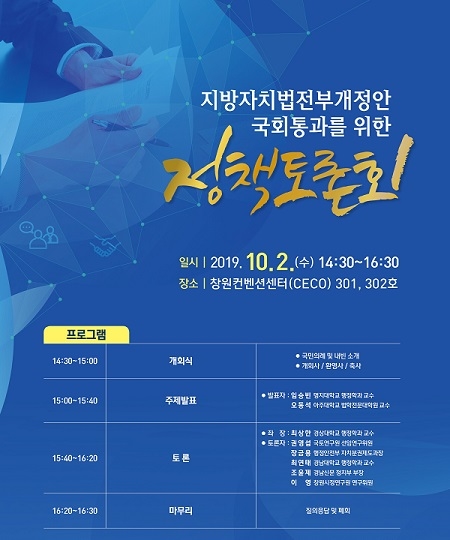 창원시 지방자치분권협의회는 오는 10월 2일 오후 2시 30분부터 창원컨벤션센터에서 지방자치법 전부개정안 조속한 국회 통과를 위한 '자치분권 정책토론회'를 개최한다고 25일 밝혔다.