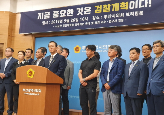 ‘시급한 검찰개혁을 촉구하는 국내 및 해외 교수·연구자 일동’은 26일 부산시의회 브리핑실에서 시국선언 발표 기자회견을 열었다.