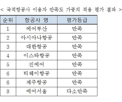 국내 항공사 가운데 에어부산이 이용자 만족도에서 안전분야와 함께 1위를 차지한 것으로 나타났다. 외국적 항공사의 경우, 일본 항공사의 만족도가 높게 나타났다.