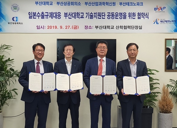 부산대학교 산학협력단은 일본 수출규제에 대응하는 ‘부산대 기술지원단’을 부산상공회의소·부산테크노파크·부산산업과학혁신원과 공동 운영하기로 하고 이에 관한 협약을 27일 오전 교내 삼성산학협동관 909호 산학협력단장실에서 체결했다고 밝혔다.