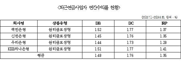 퇴직연금 적립금의 90%를 차지하는 원리금 보장형 상품의 연간 수익률을 살펴보면 올 상반기 기준 DB형은 국민은행 1.52%, 하나은행 1.51%, 신한은행 1.45%, 우리은행 1.44% 순으로 수익을 내는 것으로 나타났다.