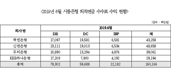 반면 퇴직연금 제도로 인한 시중은행의 수수료 수익은 늘어가고 있는 것으로 분석됐다. 회사는 퇴직금 관리를 금융회사에 맡기는 만큼 수수료를 부담하게 되는데 지난해 신한은행의 퇴직금 수수료 수익은 약 963억원으로 가장 큰 규모를 기록했다.
