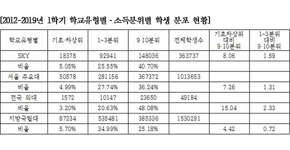 또 국내 의대에 진학한 고소득층 자녀는 극빈층인 기초생활수급자, 차상위계층 자녀보다 약 15배 많았으며 SKY의 경우에도 약 8배, 서울 주요대는 약 7.2배 많은 것으로 조사됐다.