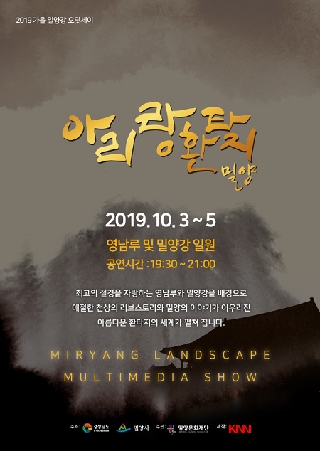 경남 밀양시는 가을이 깊어가는 10월을 맞아 오는 3일부터 5일까지 사흘간 매일 저녁 7시 30분부터 영남루와 밀양강을 환상적으로 수놓을 2019 가을 밀양강 오딧세이 '아리랑 환타지! 밀양' 공연을 펼친다.