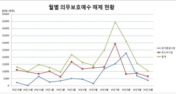 예탁원 발표 자료에 따르면 시장별 10월 의무보호예수 해제 현황은 유가증권시장 4개사 3901만주, 코스닥시장 23개사 6628만주다.