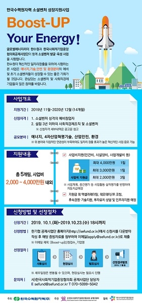 ‘Boost-UP Your Energy! 한수원 소셜벤처 성장지원사업’은 정부의 일자리 창출사업 분야 중 하나인 소셜벤처를 활성화하기 위한 프로그램으로 한수원은 이번에 처음으로 소셜벤처를 발굴·지원할 예정이다.