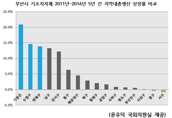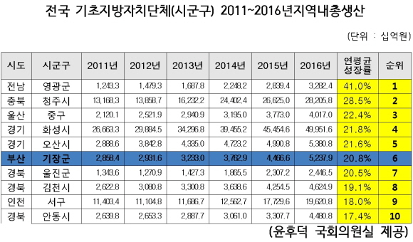 부산시 기장군이 2011~2016년 연평균 지역내총생산(GRDP) 성장률 조사에서 전국 기초자치단체 가운데 6위를 기록한 것으로 확인됐다. 부산 구·군 중에서는 1위를 기록했다.