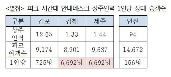 피크 시간대 안내데스크 상주인력도 인천은 94명, 김포 12.65명으로 나타났으나 제주는 1.44명, 김해는 1.33명에 불과했다. 가장 바쁜 시간대 김해국제공항은 안내데스크 직원 1명이 6692명의 승객을 응대해야 하는 꼴이다.