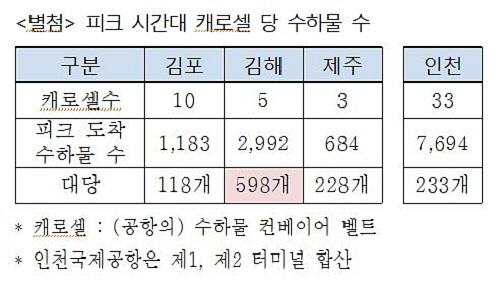 특히 피크 시간대 입국 지체의 가장 큰 원인 가운데 하나인 수하물 컨베이어벨트도 김해국제공항이 대당 가장 많이 처리하는 것으로 나타났다. 김포는 벨트 1대당 118개, 제주 228개, 인천 223개인 반면 김해는 벨트 1대당 무려 598개의 수화물을 처리하는 것으로 집계됐다.