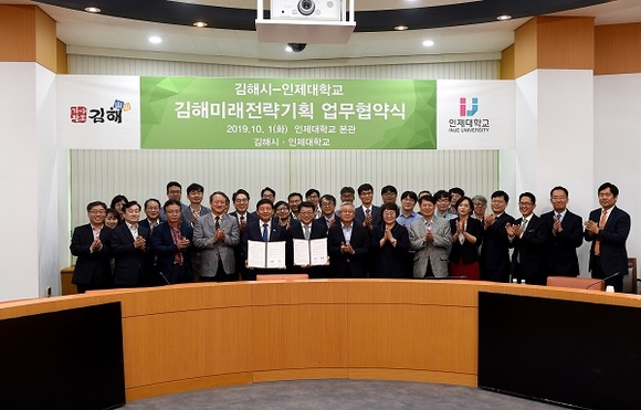 경남 김해시와 인제대학교는 1일 오전 인제대 인당관에서 업무협약을 맺고 의생명산업을 비롯한 미래 먹거리산업 발굴 싱크탱크 역할을 할 '김해미래전략기획단' 출범시켰다.