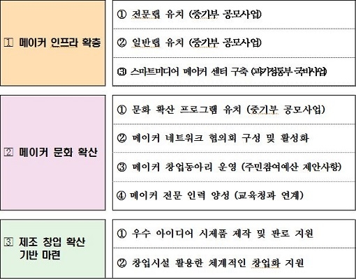 ‘인프라 확충 전략’으로는 전문랩·일반랩 유치, 스마트미디어 메이커 센터 구축이 있으며 ‘메이커 문화 확산 전략’은 메이커 네트워크 협의회 구성, 메이커 전문 인력 양성, 창업동아리 운영 등이 있다. 또 ‘제조 창업 확산 기반 마련 전략’으로 우수 아이디어 시제품 제작, 판로 지원, 부산시 창업지원사업 활용한 체계적 창업화 지원 등이 있다.