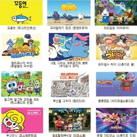 부산공동관에는 애니메이션, 캐릭터, 영상제작 등 관련 12개 기업이 참가했다. 지역 애니메이션 ▲달그락 달그락 꼬마돌 도도 ▲토템 가디언스 ▲꼬마 갈매기 런즈 ▲치치핑핑 ▲요리법사 라이 ▲캘리포니아 비치 ▲영도할매 신식당 ▲콩콩랜드 ▲그림 그리는 우주코끼리 뽀부가 선보인다.