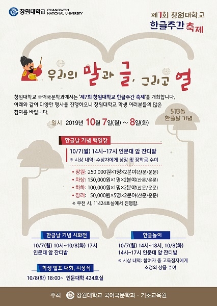 대학혁신지원사업의 지원을 통해 창원대 국어국문학과와 기초교육원이 주최하는 이번 행사는 ‘우리의 말과 글, 그리고 얼’이라는 주제로 ▲한글날 기념 백일장 ▲한글날 기념 시화전 ▲한글놀이 ▲학생 발표대회 및 시상식 등 다양한 행사가 진행될 예정이다. 한글날 기념 백일장의 각 부문별 수상자에게는 상장 및 장학금이 수여된다.