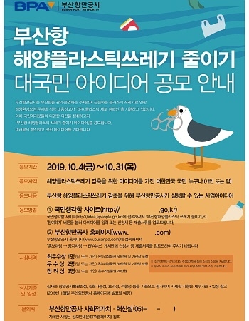 부산항만공사(BPA)가 ‘국민 관점에서 바라본’ 부산항 해양 플라스틱 쓰레기 줄이기를 위한 아이디어 발굴을 위해 4일(오늘)부터 이달 말까지 대국민 아이디어 공모전을 연다고 밝혔다.