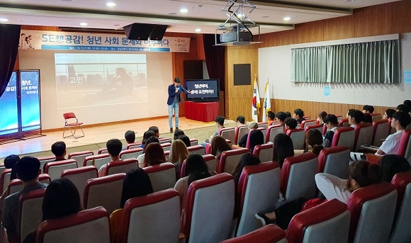 이날 ㈜유스베이스캠프 엄주환 대표가 강사로 초청돼 ‘청년이여, 꿈에 도전하자!’를 주제로 특강을 진행했으며 다양한 사회문제를 학생들과 인식하고 공감하는 시간을 가졌다.