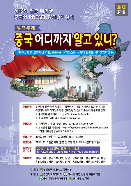부산외국어대학교 중국학부는 '제12회 전국 대학생 중국어 프레젠테이션 대회'를 오는 11월 15일에 개최한다고 밝혔다.