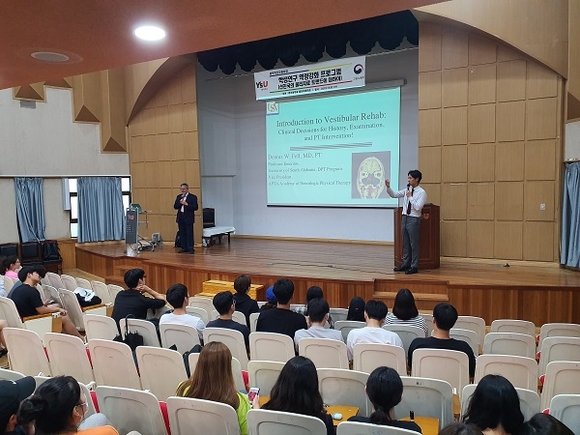 이를 위해 물리치료학과는 미국 사우스 앨라배마대학교(South Alabama University) 물리치료학과에 재직 중인 데니스 펠 교수를 초빙해 미국 현지의 정확한 물리치료 관련 최신 정보를 재학생들에게 제공하고 대화하는 시간을 가졌다.