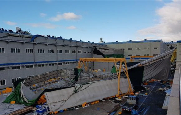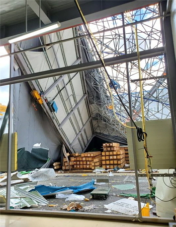 차량부품을 제조하는 B모사도 사무동의 지붕, 벽면, 출입문 등에 심각한 피해가 발생했고 자재를 보관하는 야드의 차양시설과 크레인이 붕괴되며 당분간 정상적인 생산이 어려운 상황이다.