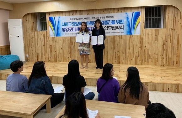 이번 협약은 동아대 링크플러스 사업단 지역사회 공헌형 프로젝트의 하나다. 앞으로 사업단은 동아대 식품영양학과를 중심으로 사하중앙지역아동센터와 오는 12월 말까지 ‘사하구 영양취약계층의 건강증진을 위한 영양코디네이팅 프로그램’을 수행한다.