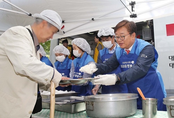 이날 임직원으로 구성된 DGB동행봉사단과 대구적십자사 자원봉사자 50여 명이 참여해 취약계층의 어르신 600여 명을 초청하고 점심식사를 대접했다