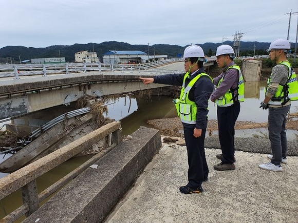 한국시설안전공단(이하 공단) 박영수 이사장은 7일 오후 태풍 ‘미탁’으로 피해를 입은 경북 영덕군 송천교를 방문해 교량 붕괴 상태를 점검했다고 밝혔다.