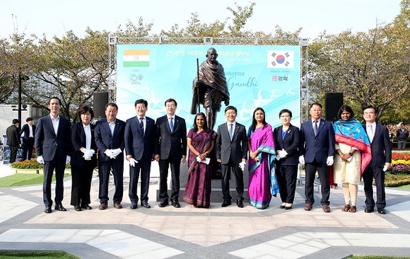 허성곤 시장은 “올해는 비폭력 저항의 상징, 마하트마 간디 탄생 150주년이자 3.1독립운동 100주년인 해”라며 “동상 건립으로 간디 정신이 김해시민의 가슴에도 영원히 남게 될 것”이라고 말했다.