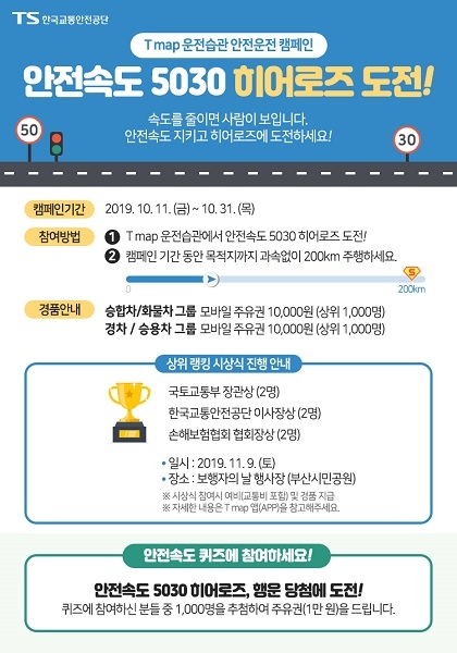 한국교통안전공단(이하 공단)은 손해보험협회와 SK텔레콤 T맵과 공동으로 10월 11일부터 31일까지 3주간 ‘안전속도 5030 히어로즈 캠페인’을 시행한다고 14일 밝혔다.
