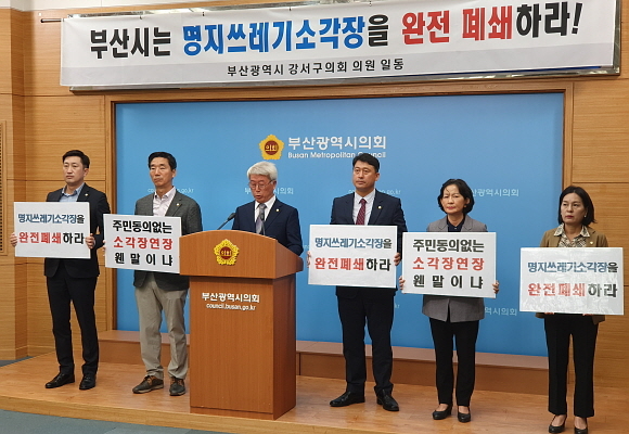 이날 의원들은 부산시에 ▲명지 쓰레기 소각장 시설 완전 폐쇄 ▲주민 동의 없는 소각장 연장 사용 반대 ▲주민 의견 무시하는 처사에 대해 공식 사과할 것을 촉구했다.