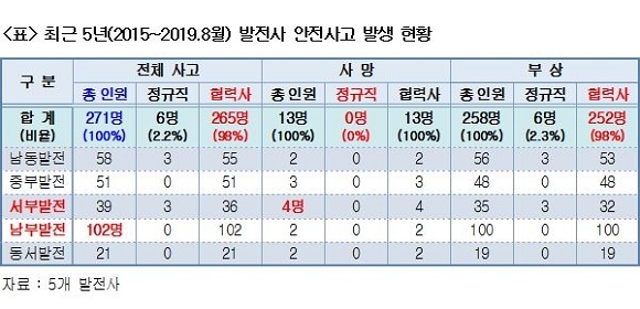 이에 따르면 5년간 전체 사상자 271명 가운데 협력사 직원이 약 98%의 비중인 265명으로 발전사 정규직 6명보다 44배 많은 것으로 조사됐다.