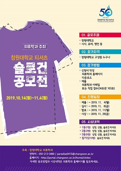 창원대학교 의류학과는 개교 50주년을 맞아 디셔츠 슬로건을 공모하고 의류학과 학생들이 선정된 슬로건을 활용한 티셔츠 작품을 직접 디자인 및 제작한다고 16일 밝혔다.