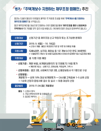 캠코 관계자는 “도움이 필요한 금융 취약계층의 쾌적한 주거 환경 조성을 돕기 위해 캠코가 관리하는 채무 관계인을 대상으로 캠페인을 추진하게 됐다”며 “채무조정을 통한 신용 회복과 주택 개보수 비용 지원 혜택을 동시에 제공하는 이번 캠페인에 많은 관심 바란다”고 전했다.