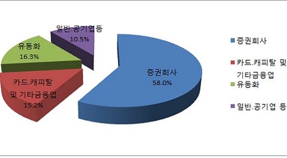 업종별로는 증권회사 167조 2000억원, 유동화회사 47조 1000억원, 카드·캐피탈·기타 금융업 43조 8000억원, 일반기업·공기업 등 30조 1000억원 순으로 발행됐다.