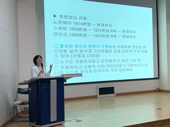 이날 초빙 강사로 나선 연세대 동서문제연구소 김인춘 사회학 교수는 “존 롤즈에 따르면 정의란 합리적 인간들이 공정한 절차를 거쳐 이룬 합의”라는 점을 강조하며 타협과 절차의 중요성을 강조했다. 김 교수는 “공정과 정의는 법의 아주 일부이며 보이지 않는 시민의 덕성, 사회적 신뢰와 투명성, 문화적 성숙도가 있을 때 정의가 구현된다”고 말했다.