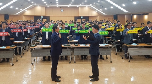 농협중앙회 조합감사위원회는 16일 농협중앙회 경남지역본부 대회의실에서 경남·부산·울산지역 농·축협 내부통제업무 담당자 및 지역검사국 직원 등 170여 명을 대상으로 ‘2019년 농·축협 내부통제강화 실천결의 대회’를 개최했다고 밝혔다.