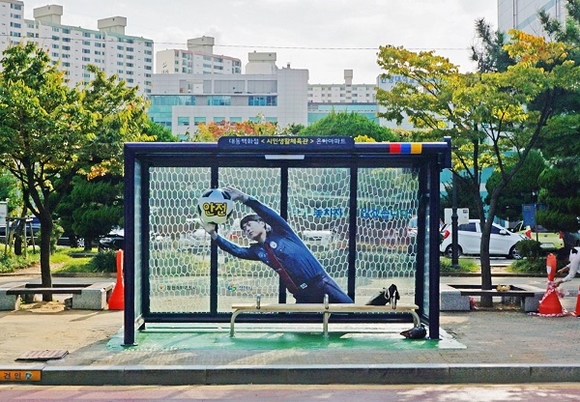 축구경기장의 골대를 연상케 하는 버스정류장의 외관과 밤길을 환하게 비추는 안전축구공을 캐칭하는 경찰관의 모습이 범죄예방 및 안전도시 창원의 이미지 제고에 도움이 될 것으로 기대된다.