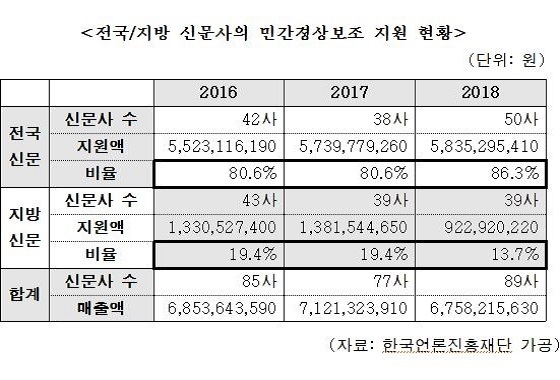 신문사 전체의 정부광고 매출액 가운데 지방신문의 매출액이 42.3%인 것에 비하면 재단의 지원사업으로 돌려받는 규모는 전국신문에 비해 턱도 없이 부족하다는 것이다.