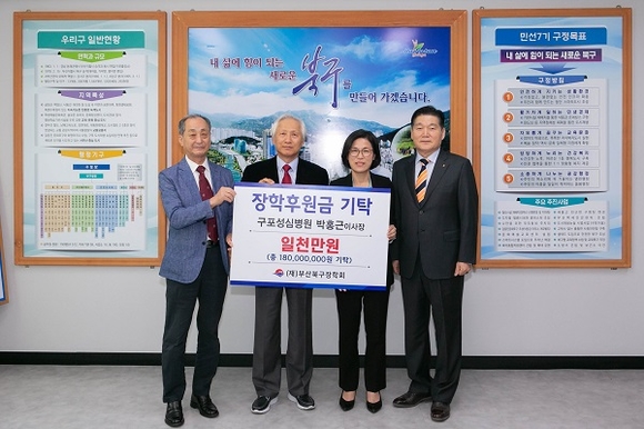 부산광역시 북구청은 구포성심병원이 지난 16일 북구 인재양성을 위해 (재)부산북구장학회에 장학기금 1000만 원을 기탁했다고 17일 밝혔다. 구포성심병원 박홍근 이사장은 1997년 장학회 설립 때부터 현재까지 총 1억 8000만 원의 장학금을 기탁했으며 2010년부터 북구장학회 이사장으로 활동하며 장학사업 활성화에 기여하고 있다.