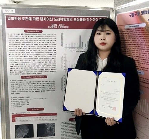 이날 식품영약학과 김지상·강옥주 교수 연구팀 소속 김정화 대학원생은 캡사이신 포접복합체의 포접률과 항산화성 평가를 주제로 사이클로덱스트린을 이용해 고추의 매운맛 성분인 캡사이신을 캡슐화하고 그 효과를 입증했다.