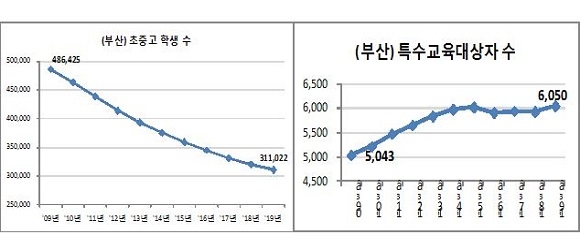 부산시교육청이 이순영 의원에 제출한 조사 자료에 따르면 10년 전에 비해 부산의 초, 중, 고 학생 수는 36% 감소해 전국 최고의 감소율을 보였다. 반면 특수교육대상자는 10년 전 5043명에서 6050명으로 20% 이상 증가율을 보였다.