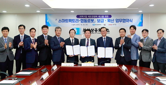 부산상공회의소(부산상의)와 BNK캐피탈, KT가 23일 오후 2시 부산상의 8층 회의실에서 ‘스마트팩토리-협동로봇’ 보급, 확산 업무협약식을 열었다.