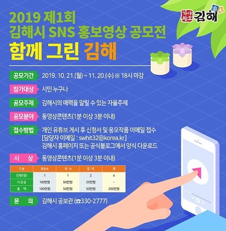 시 관계자는 “김해의 잘 알려지지 않은 모습이나 숨은 매력을 표현한 우수 영상콘텐츠를 발굴해 우리지역을 보다 더 널리 알리고 우리시 SNS에 대한 시민 관심도를 높이기 위해 이번 공모전을 기획했다”고 말했다.