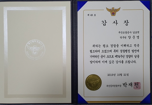 24일 부산교통공사에 따르면 지난 21일 남포역 직원 양준영(28)씨가 절도 용의자 검거에 이바지한 공로로 부산중부경찰서로부터 감사장을 받았다.