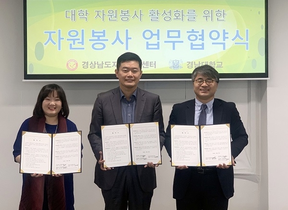 경남대학교 대학혁신지원사업단 지역사회공헌센터와 사회봉사센터는 지난 23일 오전 10시 경상남도자원봉사센터와 대학 자원봉사 활성화를 위한 ‘자원봉사 업무 협약’을 체결했다고 24일 밝혔다.