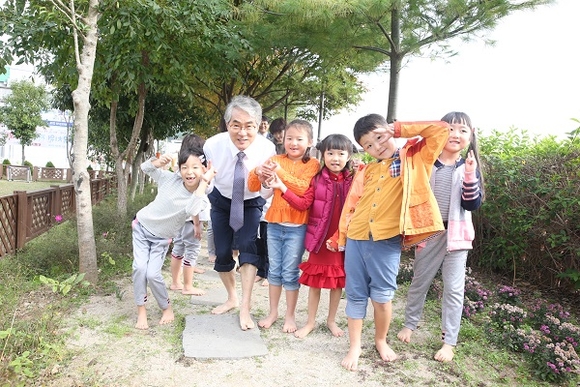 이날 박종훈 교육감은 원아들과 손잡고 맨발 걷기, 축구·사방치기 등 오감만족 놀이 교육활동에 직접 참여하며 놀이중심 유아 교육과정을 체험했다.