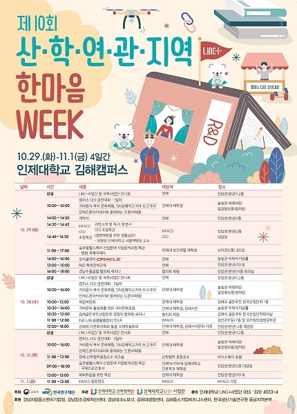 인제대학교가 오는 29일부터 내달 1일까지 김해캠퍼스 일원에서 ‘제10회 인제대학교 산·학·연·관·지역 한마음 WEEK’를 개최한다고 28일 밝혔다.
