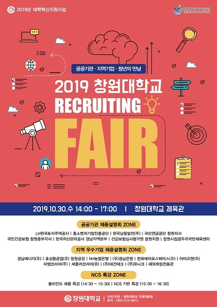 창원대학교는 오는 30일 본교 체육관에서 산학협력 혁신 및 취업연계 강화를 위한 ‘2019 창원대학교 Recruiting Fair’를 개최한다고 25일 밝혔다.
