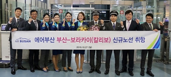에어부산은 지난 27일 김해국제공항에서 임직원들이 참석한 가운데 부산-칼리보(보라카이) 노선 취항을 위한 기념행사를 가졌다고 28일 밝혔다. 이번 부산-칼리보 노선은 국적 항공사로는 첫 개설이며 주 4회(수·목·토·일) 운항한다.