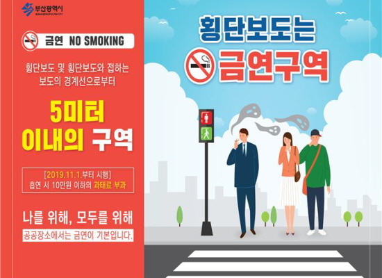 내일(11월 1일)부터 부산시 내 횡단보도와 횡단보도를 접하는 보도 경계선으로부터 5m 이내 구역이 금연구역으로 지정된다.
